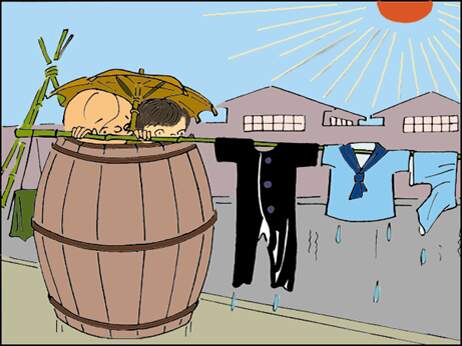 钻进木桶,把湿衣服脱下来,拧干水,搭在一根竹竿上晾着,然